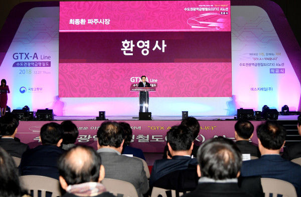 | ▲ 수도권광역급행철도(GTX) A노선 착공식에서 최종환 파주시장이 환영사를 하고 있다. (사진제공=파주시청) | ||