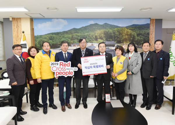 이성호 경기 양주시장은 21일 시장실에서 대한적십자사 경기도지사 최석한 사무처장에게 '적십자 특별회비' 100만원을 전달했다. 이번 특별회비 전달은 경기침체와 내수부진, 기부 감소 등으로 나눔문화가 주춤함에 따라 지역사회 기부문화 확산과 적십자 모금을 독려하기 위해 마련했다. 사진은 이 시장 및 관계자들이 기념촬영을 하는 모습. (사진제공=양주시청)