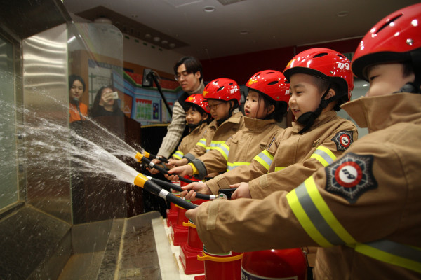 송파소방서는 21일 소방서 3층 체험교실에서 송파ECC어학원 유치부 원생들을 대상으로 소방안전 교육을 실시했다. 이날 교육은 ▲119 신고요령 안내 ▲물 소화기 체험 ▲화재 대피요령 ▲화재 안전 인형극 등 재난에 취약한 어린이들의 눈높이를 고려한 체험 방식으로 진행됐다. 사진은 어린이들이 소화기 사용 실습을 하고 있는 모습. (사진제공=송파소방서)