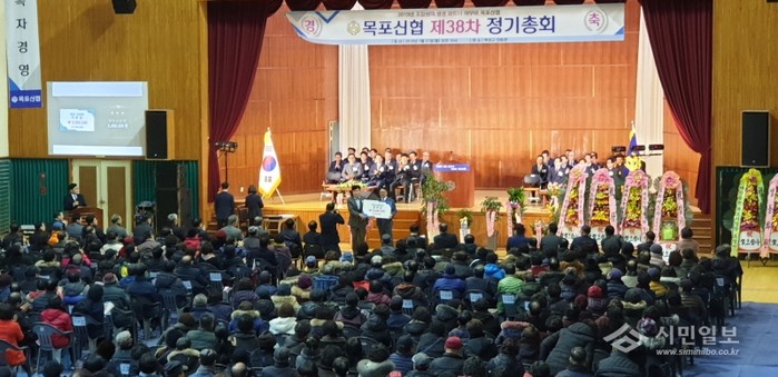 [목포=황승순 기자] 목포신협이 21일 목상고 인동관에서 김종식 목포시장을 비롯해 우기종 민주당 목포시위원장, 중앙회장,인근 전남목포·광주지역신협이사장, 조합원 등 800여명이 참석한 가운데 제38차 정기총회를 조합원 성원에 의해 개최하고 2018년도 감사보고서 및 결산보고서와 2019회계연도 사업계획 및 예산안 승인건 등의 부의안건을 처리하고 폐회했다. 사진은 박우영 이사장이 목상고 장학금을 전달하는 모습.