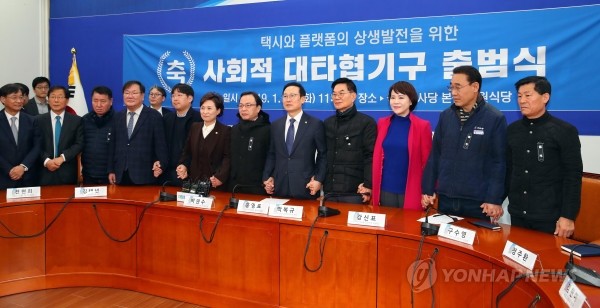 22일 오전 서울 여의도 국회에서 열린 택시와 플랫폼의 상생발전을 위한 사회적 대타협기구 출범식에서 참석자들이 기념촬영을 하고 있다. 오른쪽부터 구수영 전국민주택시노동조합연맹 위원장, 강신표 전국택시노동조합연맹 위원장, 전현희 택시·카풀 태스크포스(TF) 위원장, 박복규 전국택시운송사업조합연합회 회장, 더불어민주당 홍영표 원내대표, 박권수 전국개인택시운송사업조합연합회 회장, 김현미 국토교통부 장관, 정주환 카카오모빌리티 대표, 김태년 의원.