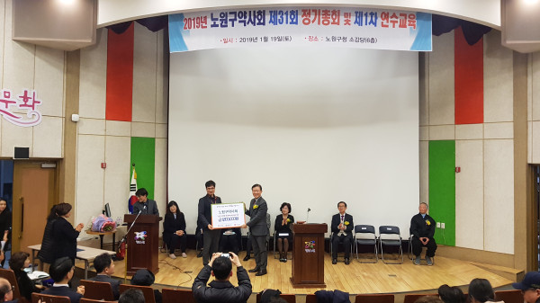 서울 노원구 약사회는 최근 지역내 저소득 가구 중고생을 위해 노원교육복지재단에 교복비 180만원을 전달했다. 약사회는 2017년부터 이 같은 기부를 이어왔다. 사진은 약사회 관계자와 교육복지재단 관계자가 기념촬영을 하는 모습. (사진제공=노원구청)