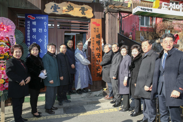서울 성동구 홍익동에서 최근 사단법인 배뱅이굿보존회가 운영하는 ‘배뱅이굿 전수소’ 현판식이 개최됐다. 배뱅이굿은 서도지역의 대표소리이며, 중요무형문화재 제29호로 지정됐다. 사진은 현판식에 참석한 배뱅이굿보존회 관계자들 모습. (사진제공=성동구청)