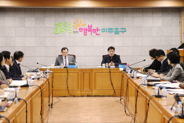 인천 미추홀구는 최근 김정식 구청장 주재로 ‘2019년 상반기 주요업무보고회’를 개최했다. 구청 소회의실에서 진행된 주요업무보고회에는 구청 전부서 및 21개 행정복지센터, 시설관리공단 등의 부서장과 담당 팀장이 참석했다. 사진은 김 구청장(가운데 오른쪽)이 발언하는 모습. (사진제공=미추홀구청)