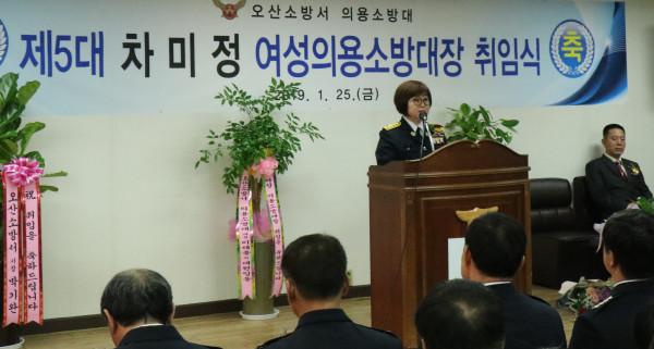 경기 오산소방서는 지난 25일 소방서 3층 대회의실에서 초청내빈 및 소방공무원, 의용소방대원 등 100여명이 참석한 가운데 제5대 오산여성소방대장 취임식을 거행했다. 사진은 차미정 신임 오산여성의용소방대장이 인사말을 하고 있는 모습. (사진제공=오산소방서)