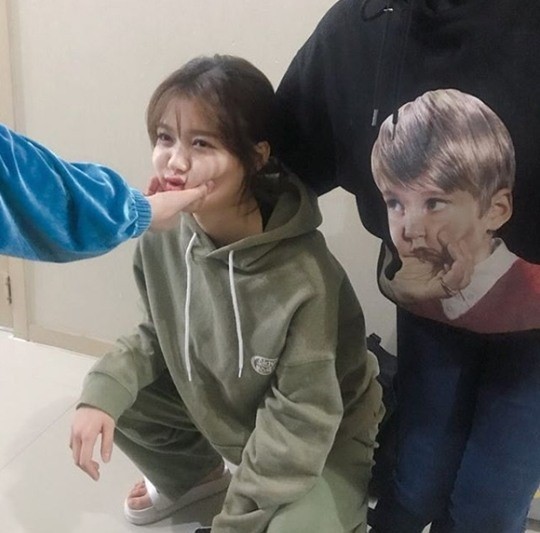 공개된 사진에는 트레이닝복을 입은 김유정의 모습이 담겨 있다. 김유정은 옆에 있는 사람 티셔츠 속 모양처럼 다른 사람이 볼을 누르고 있어 귀여운 분위기를 자아내고 있다.