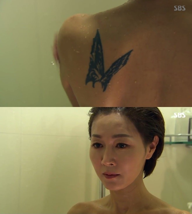 LX그룹 전략 고문 홍백희는 이날 방송에서 샤워 중에도 최진복(임채무 분) 회장의 지시를 받기 위해 핸드폰을 살피는 분주한 일상을 시작했다. 특히 그는 등에 나비 모양의 문신을 지니고 있어 또 다른 미스터리를 암시하며 시선을 끌었다.
