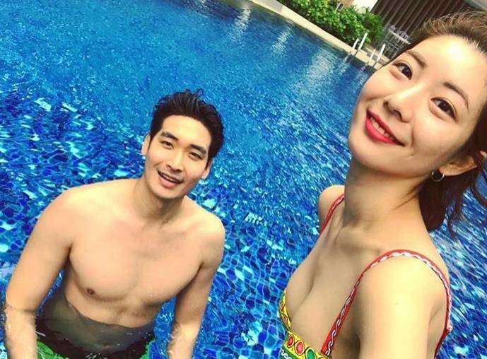 사진 속 정겨운은 아내 김우림과 함께 수영장에서 수영을 즐기는 모습. 카메라를 바라보며 밝은 미소를 지어보이고 있다.