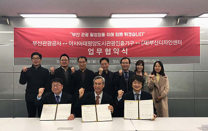 재단법인 부산디자인센터(원장 강경태)는 부산 지역 관광 활성화를 위해 지난 28일 부산디자인센터에서 부산관광공사(사장 정희준), 아시아태평양도시관광진흥기구(이하 TPO, 사무총장 김수일)와 업무협약식(MOU)을 진행하였다.