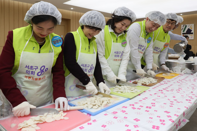 이 날 구의원들은 회기가 아닌데도 아침 10시부터 구의회 본회의장 3층 로비에서각자 앞치마와 머릿수건을 두른 후 떡을 썰고, 마련한 사골국물을 육수통에 정성스럽게 담았다. 이어 새해덕담 스티커를 붙이고 작은 종이백에 썰은 떡과 함께 담아 떡국세트를 만들었다.