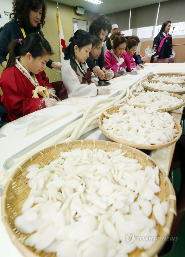 31일 오전 인천 계양구 계산동 대한적십자사 인천광역시지사 북부희망나눔봉사센터에서 열린 '다문화가족과 함께하는 설맞이 사랑의 떡국나눔' 행사에서 다문화가족들이 가래떡 썰기 체험을 하고 있다.