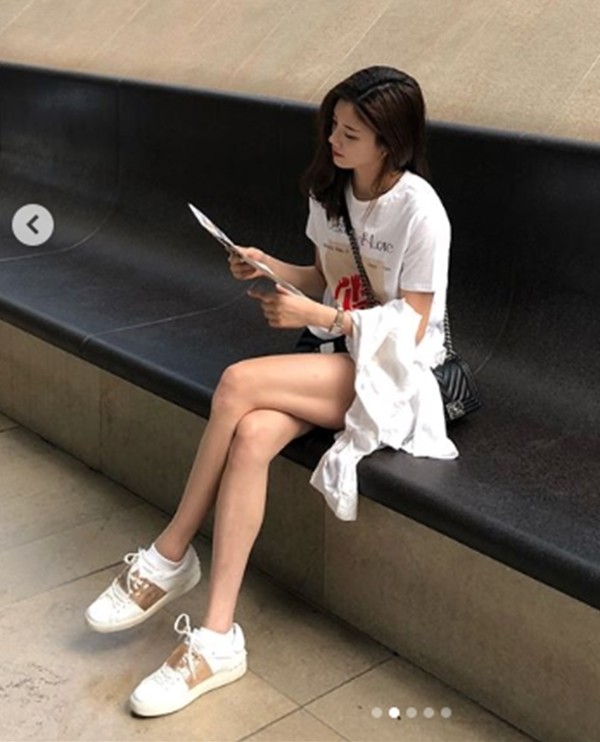 사진 속에서 이주리는 희색 티셔츠와 반바지를 입고 의자에 앉아 있는 모습으로 눈길을 끌었다.
