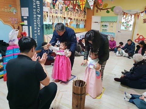 | ▲ ※사진설명: 책읽는어린이집에서 1․3세대 행복나눔행사(전통놀이 체험)가 진행되고 있다. | ||
