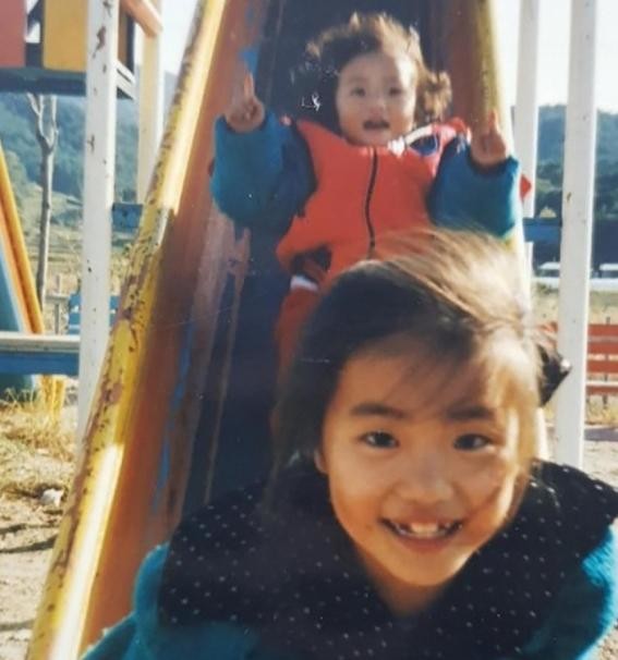 사진 속 어린 홍진영과 홍선영은 놀이터에서 환한 웃음을 지으며 카메라를 응시하고 있다.