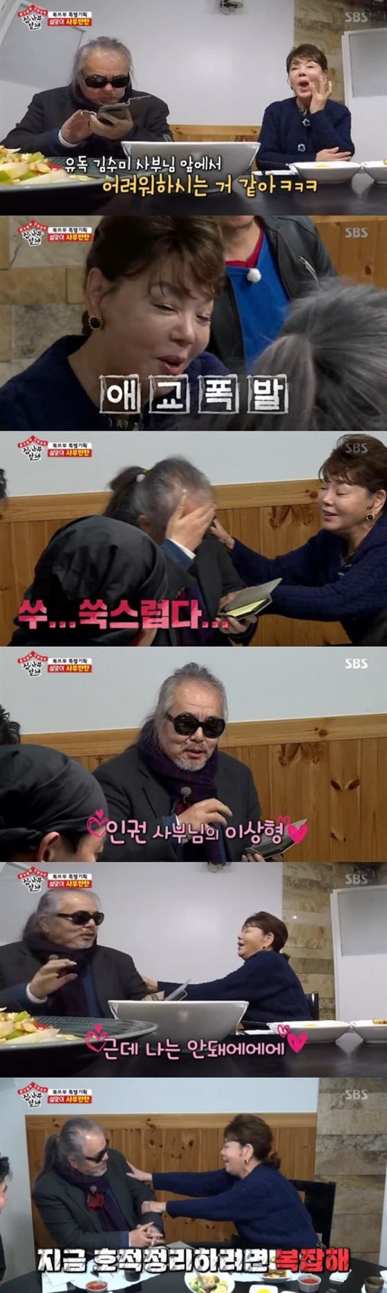 두 사람을 지켜보던 이승기는 "전인권 사부님이 유독 김수미 사부님 앞에서 어려워하시는 것 같다"고 말했다. 김수미는 "나 안 어렵다"면서 전인권의 팔을 붙잡고 애교를 보였다.