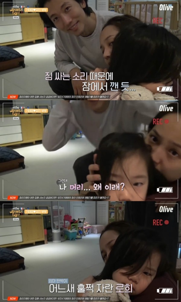 짐을 다 쌌을 무렵, 기태영의 뒷모습과 함께 한 인영이 유진에게로 다가와 안겼다. 바로 기태영·유진 부부의 딸 로희였다.
