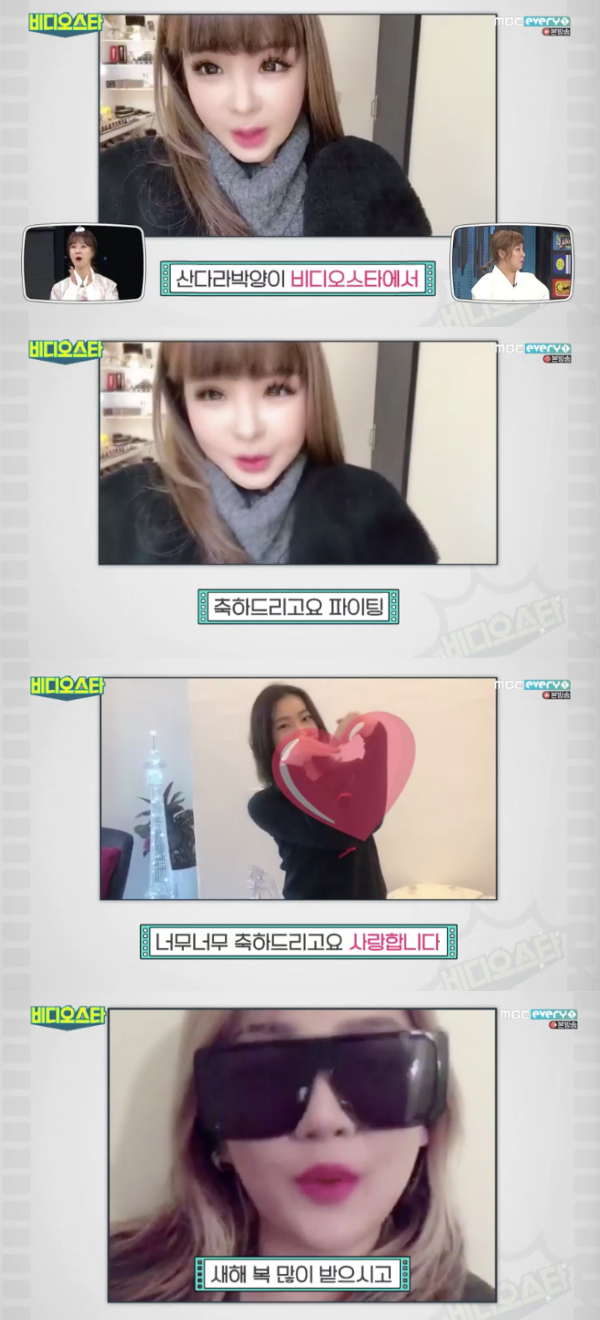 최근 방송된 MBC에브리원 예능프로그램 ‘비디오스타’에서는 새 MC 산다라박을 위한 축하 영상이 공개됐다.