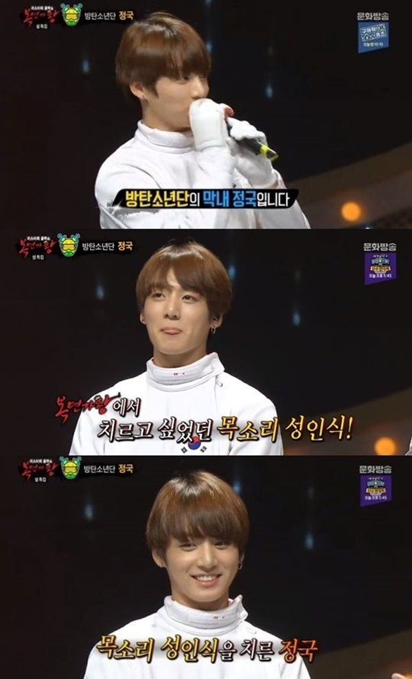 최근 방송된 MBC '설특집 화제의 복면가왕'에서는 펜싱맨으로 출연했던 방탄소년단 정국의 모습이 다시 전파를 타며 '아미'들을 사로잡았다.