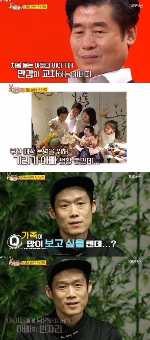 부산 매장을 운영하기 위해 기러기 생활을 하게 된 이홍운 팀장은 "아내가 혼자 애 셋을 열심히 돌보고 있다. 정말 보고 싶죠. 애들이 너무 보고 싶어서 거의 와이프가 애기 사진을 하루에 평균 다섯장 정도씩 보내는 것 같아요. 며칠 전에 첫째 딸이 생일이었어요. 근데 전화와서 아빠 안 올거지? 이러는데"라며 외로움과 그리움을 고백했다. 영상을 지켜보던 이연복은 "저런 얘기는 생전 안 했는데"라며 미처 몰랐던 아들의 고민에 눈시울을 붉혔다.