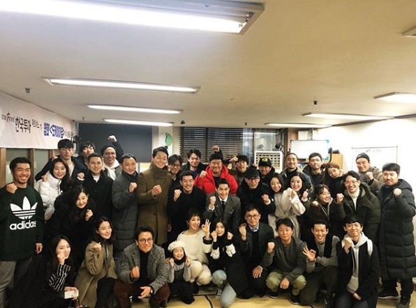 사진에서 배정남은 사람들 사이에서 슈트를 입은 채 파이팅을 외치고 있는 모습으로 눈길을 끌었다.