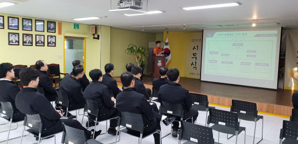 서울 송파소방서는 최근 소방서 3층 회의실에서 긴급구조통제단 기능숙달을 위한 도상훈련을 실시했다. 긴급구조통제단 훈련은 사고유형, 단계별 현장 지휘관의 작전지휘절차와 통제단 부·반별 임무 숙지 등의 신속한 통제단 가동 및 현장지휘체계 확립을 위해 실시하는 훈련이다. 사진은 소방서 관계자가 긴급구조통제단 조직체계에 대해 설명하는 모습. (사진제공=송파소방서)