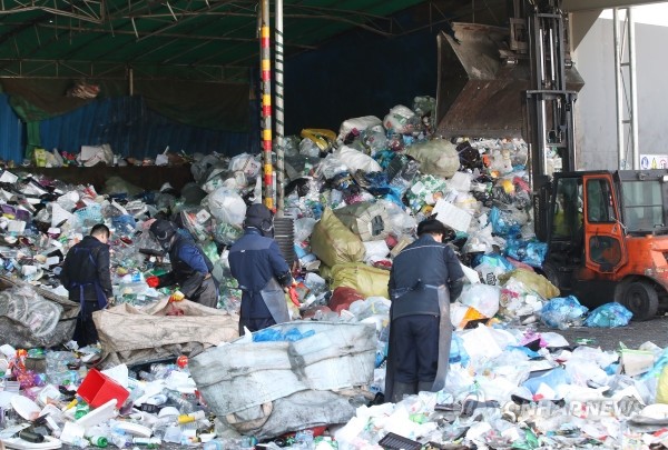 7일 오후 경기도 용인시 처인구 용인시재활용센터에서 직원들이 설 연휴 이후 수거된 재활용품을 정리하고 있다.