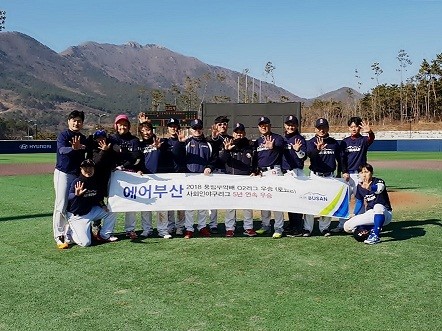 에어부산 야구단은 지난 2일 소속 사회인 야구리그인 풍림무약배 O2 리그 플레이오프 결승전에서 상대팀을 역전 끝내기 안타로 9 대 8 승리하며 우승컵을 거머쥐었다고 에어부산 관계자는 전했다.
