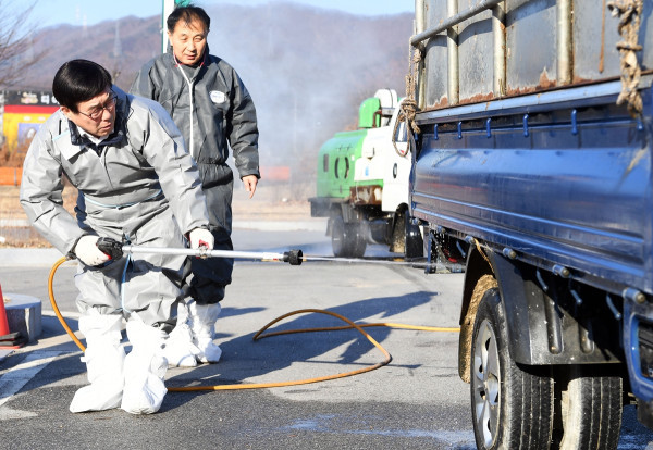 신동헌 경기 광주시장은 7일 곤지암읍 삼리 소재 구제역 거점 소독시설을 방문해 차단방역 상황을 점검하고 방역관계자들을 격려했다. 사진은 신 시장이 구제역 방역을 하고 있는 모습. (사진제공=광주시청)