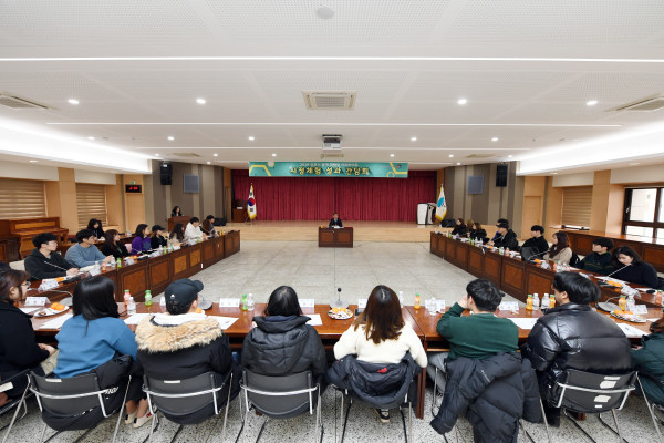 경기 김포시는 최근 이번 겨울에 진행한 겨울방학 대학생 아르바이트 사업을 완료했다. 사진은 아르바이트 종료일에 정하영 시장과 대학생들이 이야기를 나누고 있는 모습. (사진제공=김포시청)