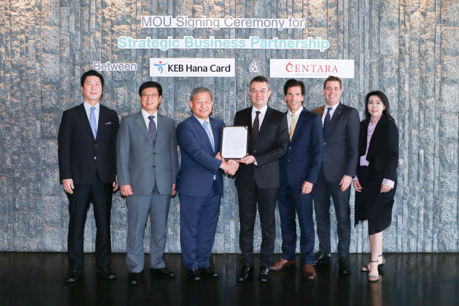 | ▲ (왼쪽부터 오른쪽 순으로)센타라 호텔&리조트 한국지사 최철훈 이사, 하나카드 글로벌마케팅부 한경호 부장, 하나카드 글로벌성장본부 홍장의 본부장센타라 호텔&리조트 시라윳 치라시밧 회장, 센타라 호텔&리조트 마클랜드 블라이크락 부회장, 센타라 호텔&리조트 톰 스루셀 마케팅 부사장,센타라 호텔&리조트 주라이랏 몽콜윙시리 영업 부사장 | ||