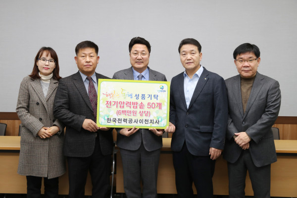 한국전력공사 이천지사가 경기 이천시가 진행하는 ‘행복한동행’ 사업에 최근 전기압력밥솥 50개를 기탁했다. 기탁받은 밭솥은 읍·면·동 행정복지센터를 통해 교체가 필요한 취약계층에게 전달된다. 사진은 기탁식에서 관계자들이 기념촬영을 하는 모습. (사진제공=이천시청)