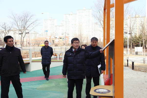 이훈성 수원시 팔달구청장은 8일 무장애통합놀이터 사업 및 주요 현안사업 확인을 위해 양지말어린이공원, 숙지공원, 서호꽃뫼공원 3개 공원의 현장방문을 실시했다. 사진은 이 구청장 및 관계자들이 공원 현장을 살펴보는 모습. (사진제공=수원시청)