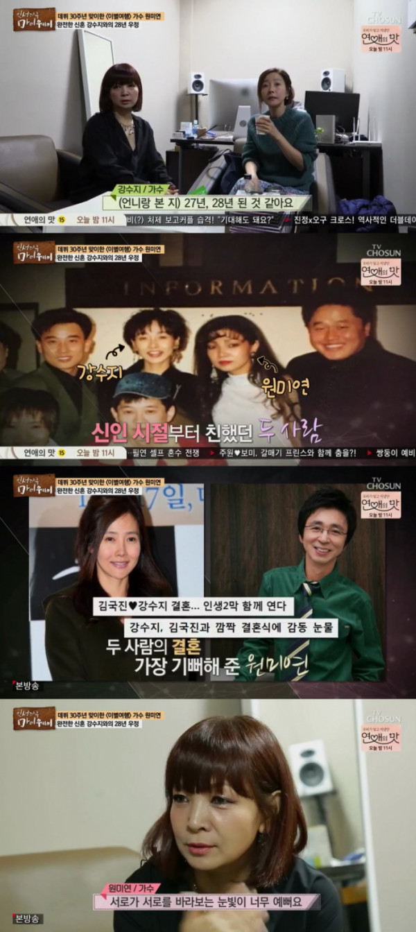 최근 방송된 TV조선 ‘인생다큐 마이웨이’에서는 데뷔 30주년을 맞이한 원미연과 28년간 우정을 이어온 강수지의 모습이 전파를 탔다