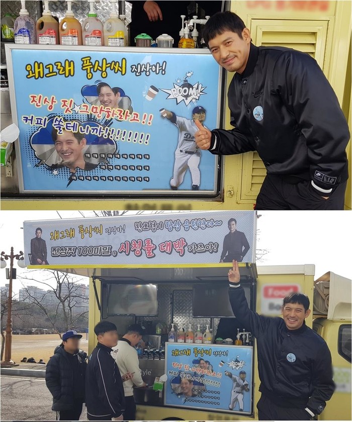 공개된 사진 속에는 오지호가 지난 5일 박찬호가 보낸 커피차 앞에서 환한 미소를 지으며 고마운 마음을 표현하고 있다. 박찬호는 풍성한 음료가 마련된 커피차에 센스 넘치는 현수막을 내걸어 오지호에 대한 응원의 마음을 전했다.
