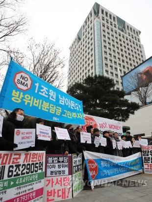 시민사회단체 평화와통일을여는사람들 회원들이 10일 오후 서울 종로구 외교부청사 앞에서 10차 방위비분담 특별협정 가서명 중단 및 재협상 촉구 기자회견을 열고 구호를 외치고 있다.