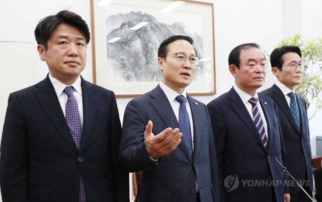 바른미래당 유의동 원내수석부대표(왼쪽부터), 더불어민주당 홍영표 원내대표, 민주평화당 장병완 원내대표, 정의당 윤소하 원내대표가 11일 국회 운영위원장실에서 자유한국당 일부 의원들의 ‘5.18 망언’ 관련 공동대응 방침 발표하고 있다.