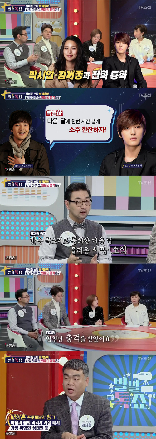 이에 문화평론가는 "그 또한 미스테리다"라고 답한 후 "박용하가 자살 전에 박시연, 김재중과 전화통화를 했다"고 운을 뗐다.