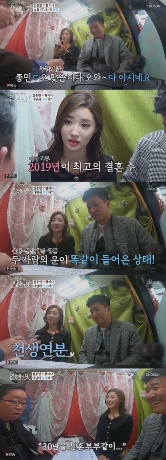 역술가는 이어 두 사람의 결혼 시기도 일치한다고 말했다. 그는 "황미나는 결혼수가 계속 있다. 올해 애인이 생기면 내년에 남편이 들어온다. 그런데 이 때를 지나면 남편 기운이 안 들어온다. 애인만 있게 된다"고 말했다. 그러면서 "김종민은 대운이 똑같이 들어왔다. 내년이 평생 중 가장 좋은 해다"고 덧붙였다.