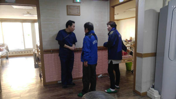 경기 남양주시 호평·평내행정복지센터는 11일 노인요양시설 화재 안전점검을 실시했다. 이날 점검은 지역내 시설 2곳의 소방시설을 확인하고, 화재예방 교육과 관련한 홍보물을 나눠줬다. 사진은 센터 관계자들이 시설 관계자와 이야기하는 모습. (사진제공=남양주시청)
