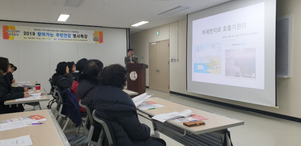 경기 화성시 여울보건지소는 12일 동탄4동 지역사회보장협의체와 함께 동탄중앙어울림센터에서 ‘2019년 찾아가는 주민건강 명사특강’을 진행했다. 이날 한림대학교 동탄성심병원 백문성 호흡기내과 교수가 미세먼지와 호흡기 건강관리에 대한 특강을 했다. 사진은 특강이 진행되고 있는 모습. (사진제공=화성시청)
