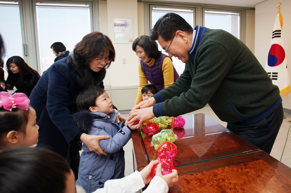 11일 동대문구청 기획상황실에서 지역 가정어린이집연합회 주최로 ‘사랑의 저금통’ 전달식이 개최됐다. 이날 전달식에서는 어린이집 36곳의 원아들이 모은 263만3320원의 성금이 전달됐다. 사진은 어린이들로부터 성금이 든 돼지저금통을 전달받고 있는 유덕열 구청장의 모습. (사진제공=동대문구청)