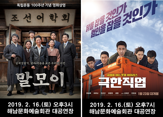해남군은 오는 16일 오후 3시와 7시, 최신개봉영화인‘말모이’,‘극한직업’을 군 문화예술회관 대공연장에서 상영한다.