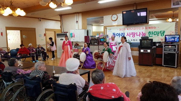 경기 수원시 권선구 복조리공연단 40여명은 12일 고색동 노인전문요양원에서 '동아리 사랑나눔 한마당' 공연을 진행했다. 권선구 복조리공연단은 지역내 주민자치센터 동아리로 구성된 공연단이다. 사진은 단원들이 민요 공연을 선보이는 모습. (사진제공=수원시청)