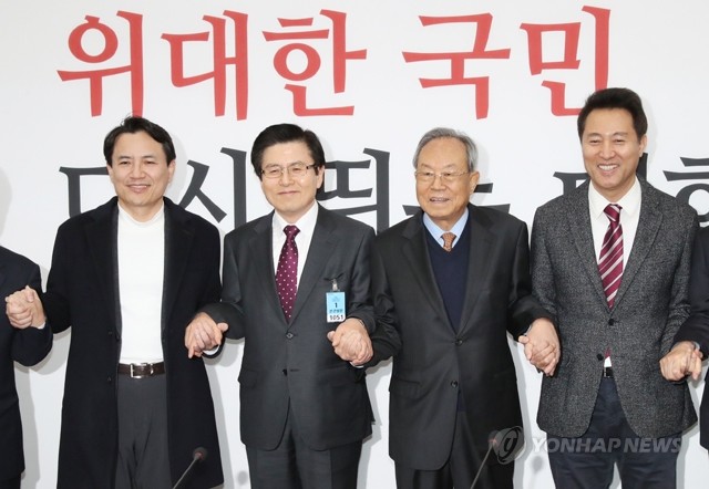 자유한국당 당 대표 후보로 등록한 김진태 의원, 황교안 전 총리, 오세훈 전 서울시장이 13일 오전 국회에서 박관용 선관위원장과 선전을 다짐하며 손을 맞잡고 있다.