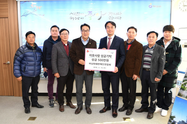 경기 하남시 화훼판매인연합회는 13일 시청을 방문해 지역내 어려운 이웃에 전달해 달라며 ‘사랑愛나눔 이웃돕기’ 성금 500만원을 기탁했다. 사진은 이날 기탁식에 참석한 김상호 시장(오른쪽에서 네번째)과 회원들이 기념촬영을 하는 모습. (사진제공=하남시청)