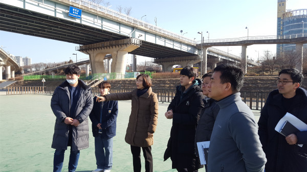| ▲ 송명화 의원이 보드 동호인 등 관계자들과 함께 광나루 한강공원을 둘러보고 있다. (사진제공=서울시의회) | ||