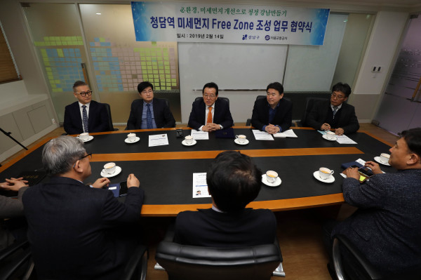 최근 정순균 강남구청장이 구청 본관 3층 제1작은회의실에서 청담역을 미세먼지가 없는 자연과 일상이 어우러지는 휴식공간으로 탈바꿈하는 미래역사조성사업인 ‘청담역 미세먼지 Free Zone 조성 업무협약식’을 열고 김태호 서울교통공사 사장과 함께 협약을 맺었다. 사진은 정 구청장이 협약 전 관계자들과 업무협의를 하고 있는 모습. (사진제공=강남구청)
