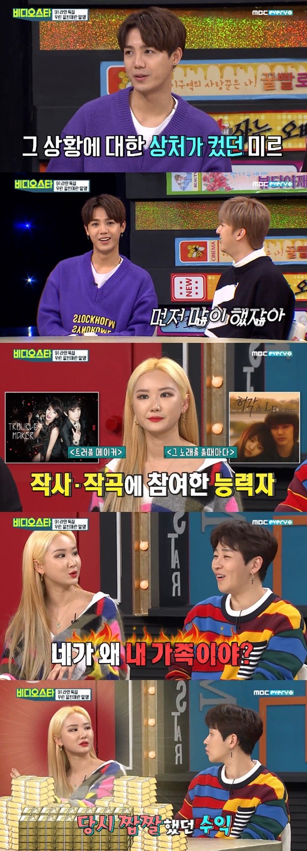LE는 “‘트러블메이커’랑 ‘그 노래를 틀 때마다’ 두 곡이 합산 돼서 그때가 가장 많이 벌었다”고 말했다. 미르는 “음악적으로 정말 훌륭한 친구다”라고 인정했다.