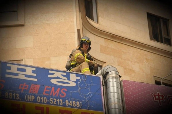공개된 사진 속 김성원은 건물 위에 올라서 소방복 차림으로 앉아 있어 눈길을 모으고 있다.