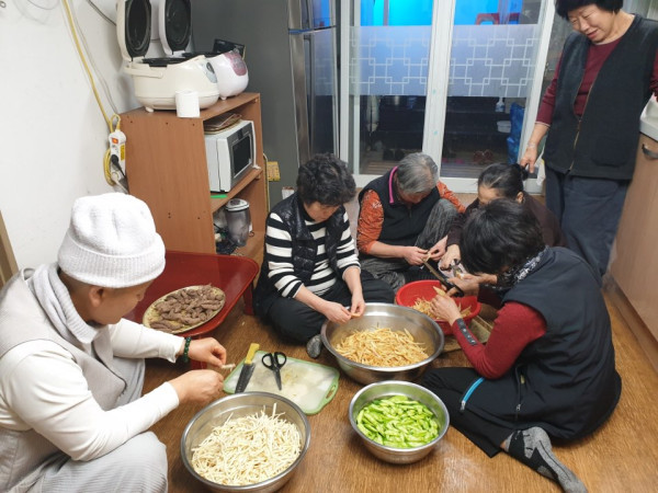 서울 은평구 구산동 주민센터는 최근 동 소재 사찰 도명암과 함께 저소득가정 33가구에 밑반찬을 지원했다. 이날 반찬은 거동이 불편한 노인들과 저소득 가정에 전달됐다. 사진은 봉사자들이 도명암 주지스님과 함께 밑반찬을 만들고 있는 모습. (사진제공=은평구청)